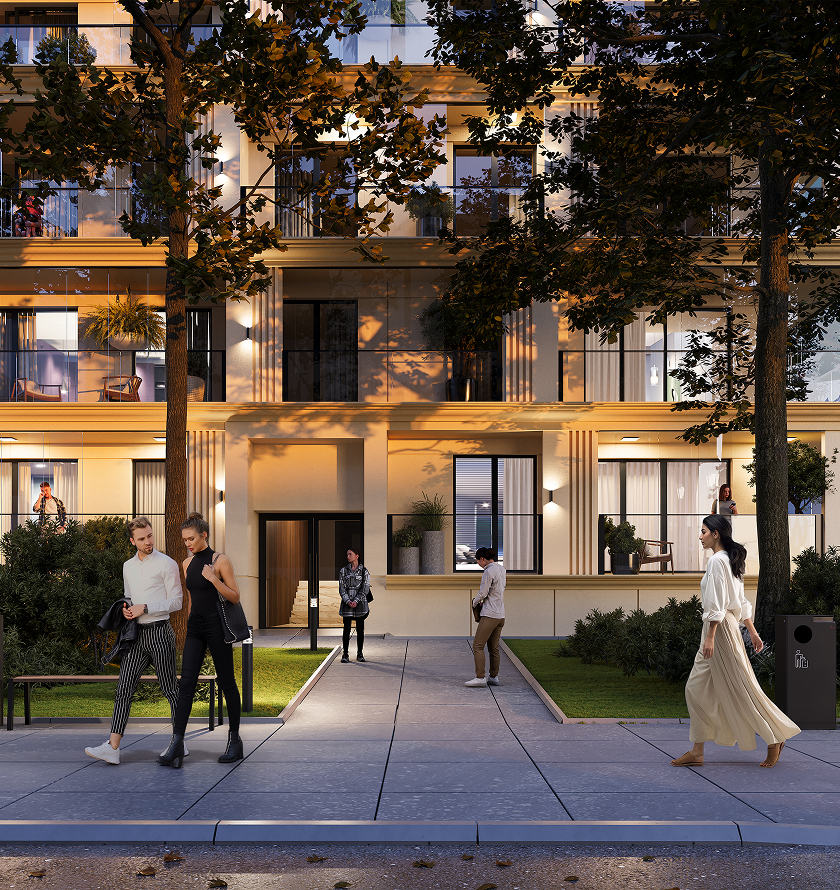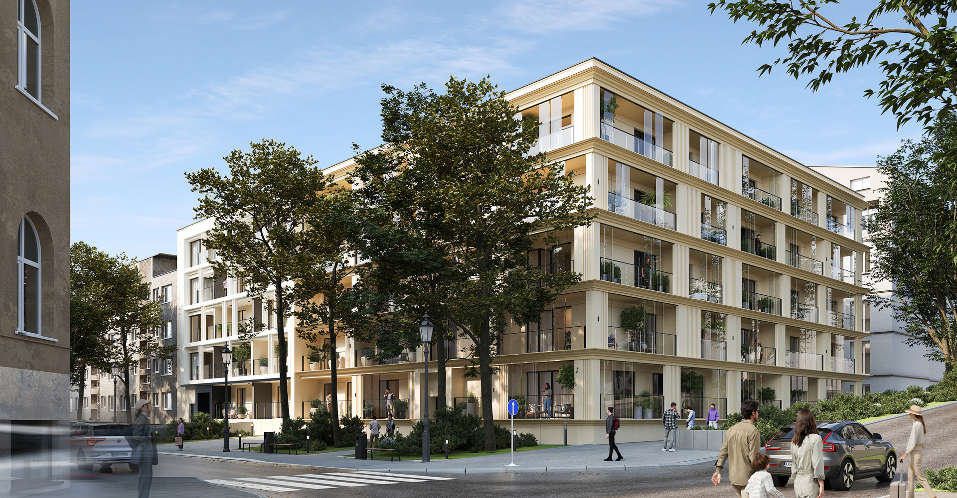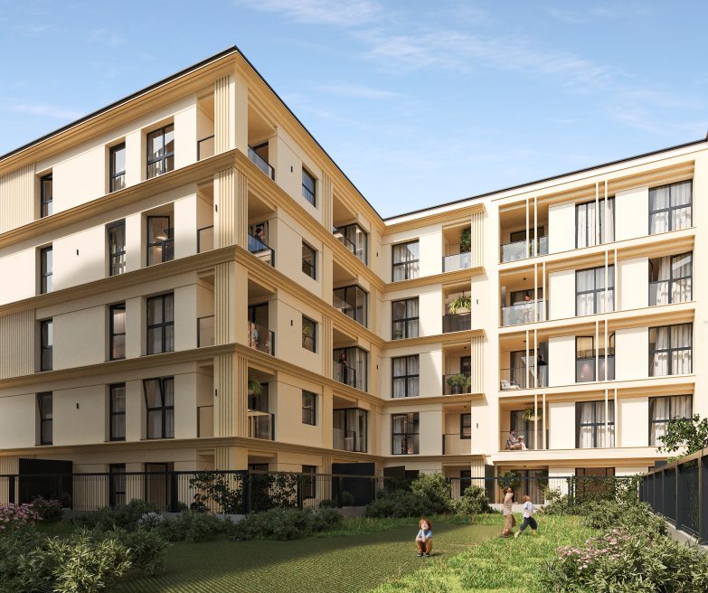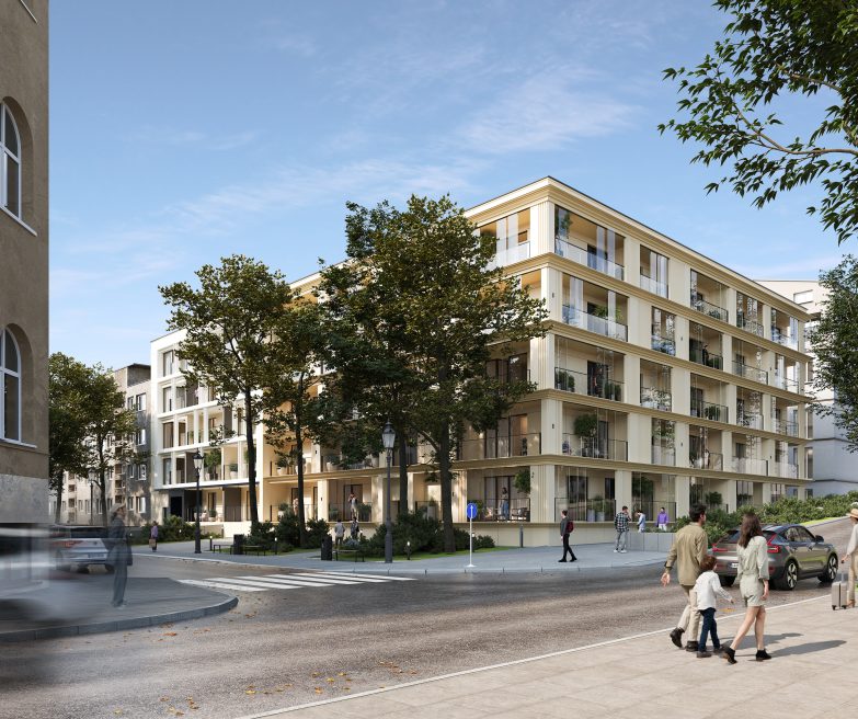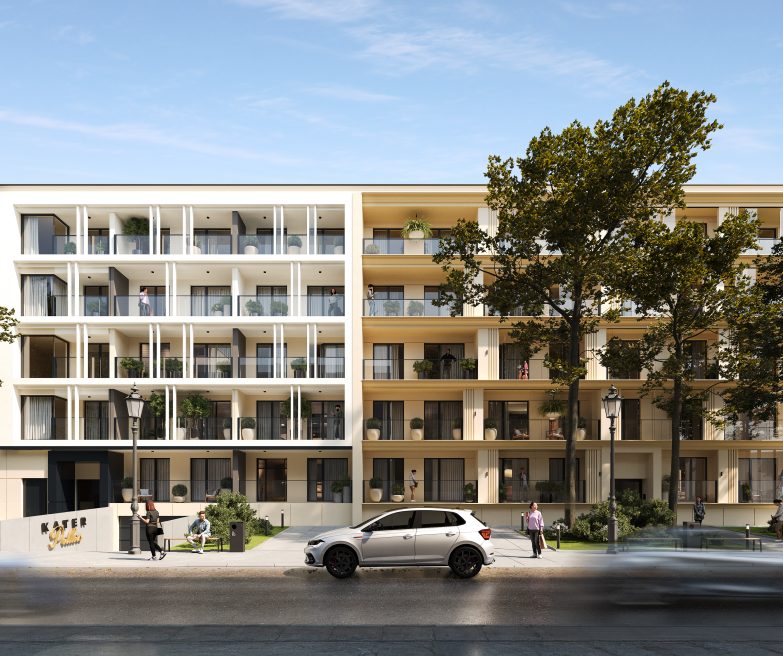 Kater Pallas to przykład architektury, która łączy elegancję współczesnych form z charakterem miejskiej zabudowy. Jasna elewacja, rytmiczne podziały balkonów i subtelne pionowe detale sprawiają, że budynek naturalnie wpisuje się w otoczenie sąsiadujących kamienic, jednocześnie wyróżniając się swoją lekkością i nowoczesnym sznytem.